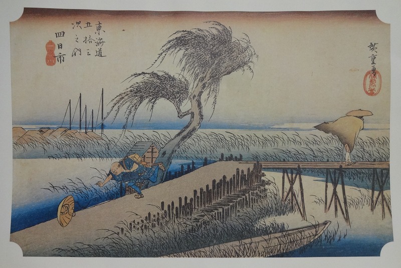 小さな木橋と葦の生い茂る鄙びた雰囲気の画。強い風は柳の枝を大きく吹きなびかせ、水際の葦原もみなそよいでいる。橋の上を渡る旅人は風に飛ばされまいと合羽をしっかりと押さえ、土手では転がる笠を追いかける姿が画かれている。奥には船の帆柱が立ち並び海が近くに迫っている事がイメージされる。