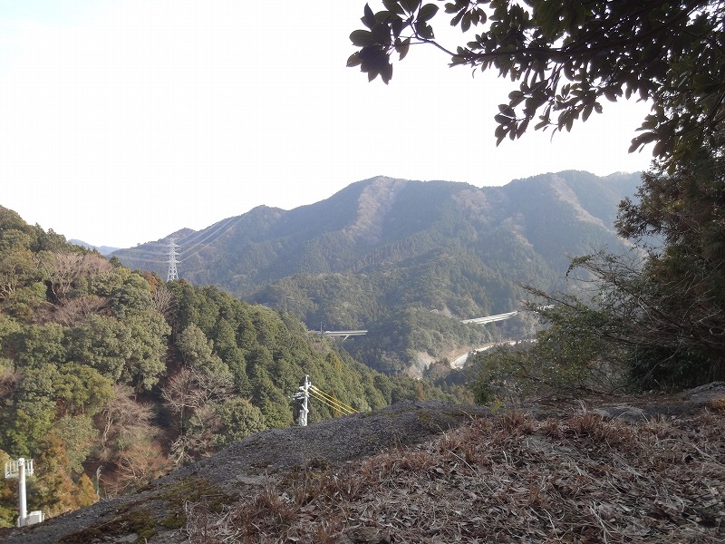 杉林の奥にコンクリート橋脚が聳え立つ。