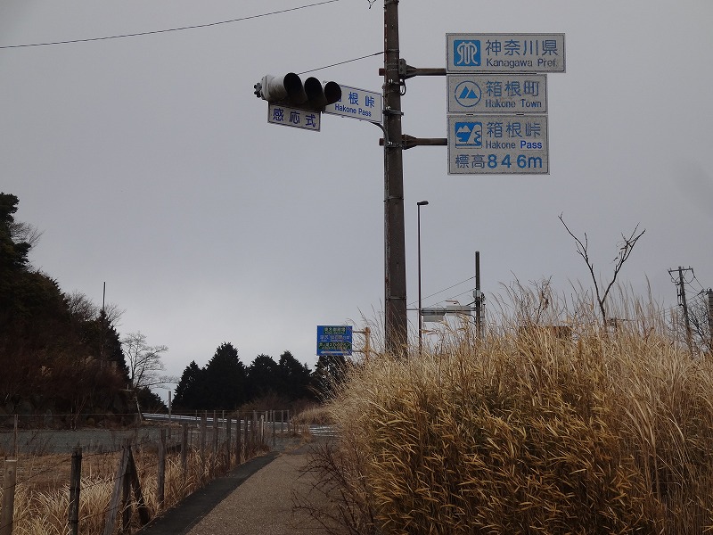 旧街道の箱根峠はまだ上に登らねばならない。ということで、箱根くらかけゴルフ場へ通じる道路を漕ぎ上がる。看板も何も無いが、きっとここが旧東海道の箱根峠。標高855m。長かった静岡県(伊豆の国)さようなら、神奈川県(相模の国)こんにちは。いよいよ関東じゃん!
