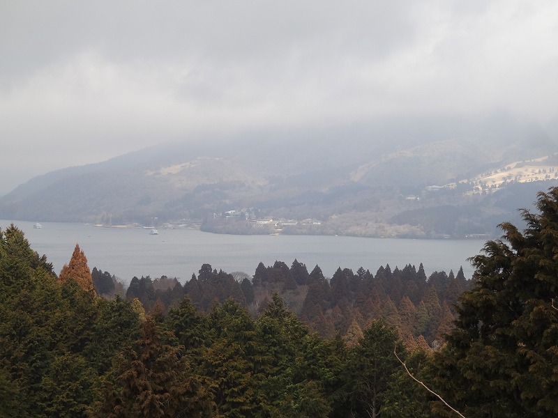 賽の河原付近から、波の高まる芦ノ湖と箱根神社の鳥居を望む。やはり富士山はどこにも見えない。