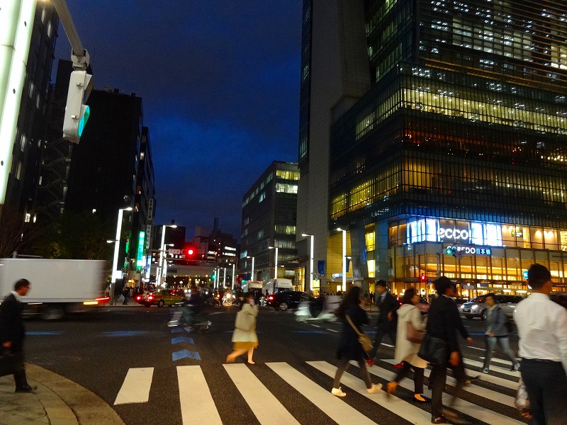 仕事帰りのサラリーマンで溢れている日本橋。江戸時代の日本橋よりもすいぶんと道幅は広く、橋の上は高速道路でフタをされている。広重の画は夜明け前の早朝の日本橋を描いているが、すっかり日が暮れてしまい、夜の日本橋となってしまった。