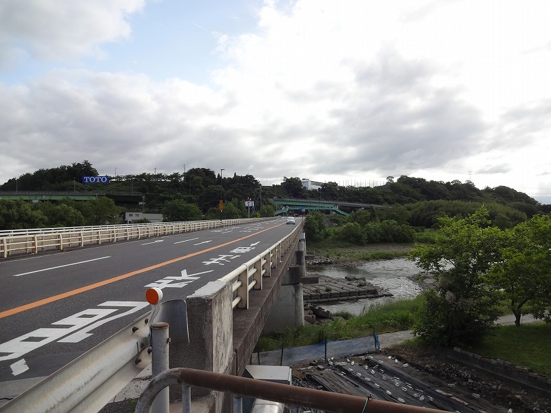 野洲川に掛かる横田橋を渡る。右側には歩道が無いので一旦高架下に下りて反対側の歩道を進む。野洲川に掛かる横田橋を渡ると国道1号線に合流する。トラックやダンプがとても多いが1号線とはすぐに離れる。