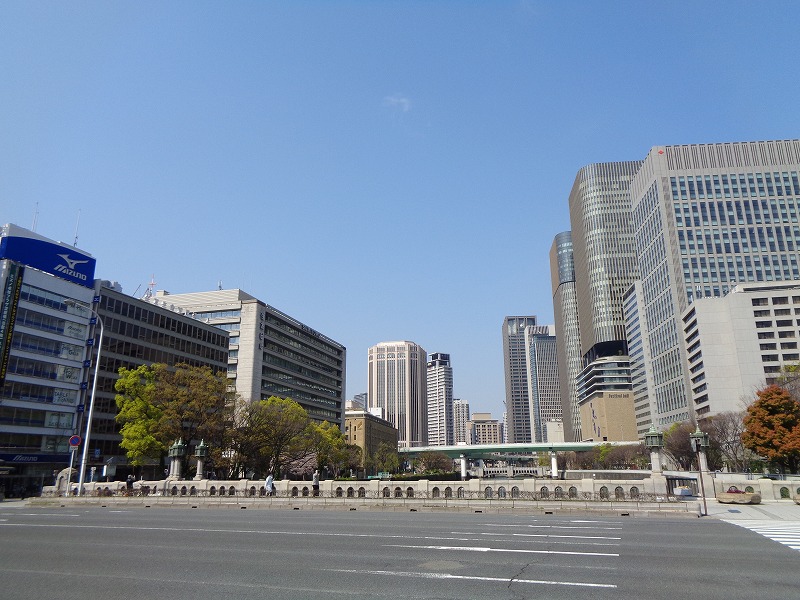 高麗橋。出っ張っちゃってる三菱UFJ銀行大阪ビル 。景観が台無しのような気がする。景観と活性化の両立を目指したが、規制緩和は失敗だな。