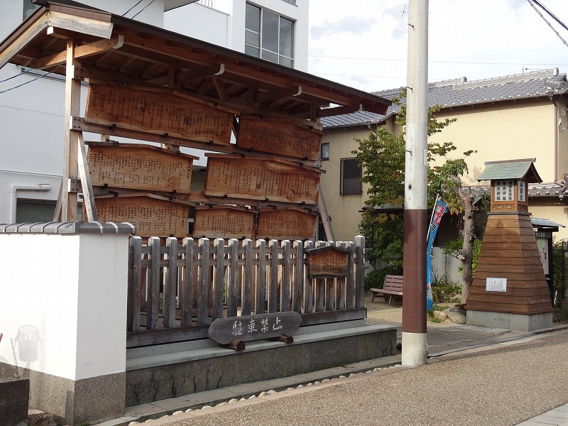 江戸時代の高札場を再現している。江戸幕府は正徳元年(1721)5月に全国一斉に禁令を公布し、主要な街道筋に高札場を設けた。ここ小浜にも東寺の高札が6枚と慶応二年(1866)の1枚が現存している。目の前に立つ電柱はどないかならんもんかねぇ。