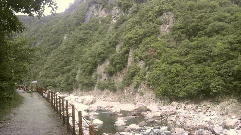 枕木のすき間からは川面が見える。柵があり通れないので横の通路を通る。