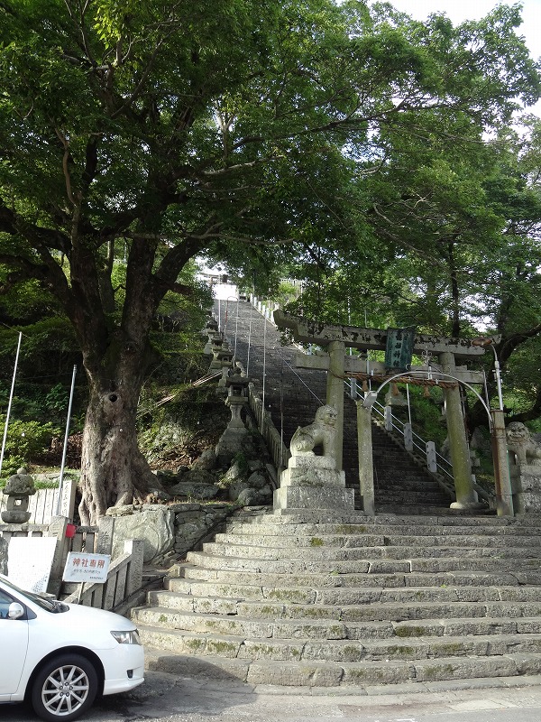 佐古三番町にある諏訪神社の石段。住宅地の脇まで山が迫り急斜面の上に神社がある。