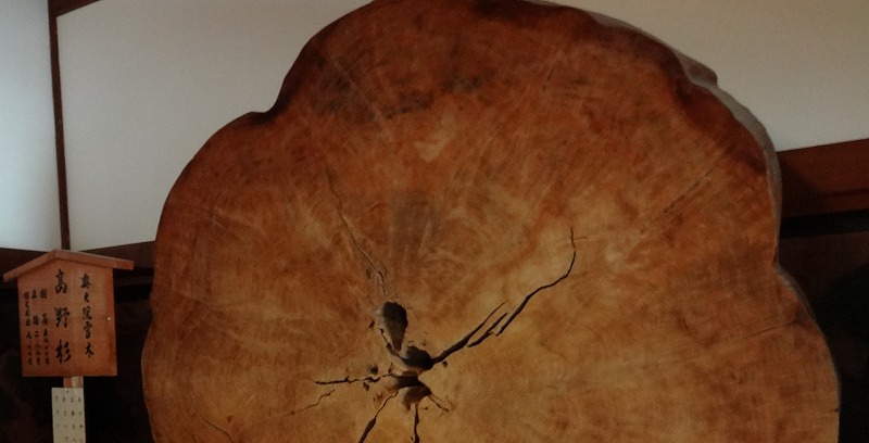 入り口には奥の院霊木高野杉の輪切りが飾られている。樹高57m、直径2.87m、根元周囲9m・樹齢700年とのこと。とても立派な杉の木だ。
