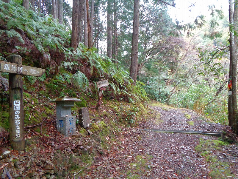 塚地公園から県道39号線を逸れると、遍路道が塚地峠へと続いている。自転車で進もうとすると塚地公園で休憩していたお遍路さん夫婦に、雨上がりでぬかるんでいるよと教えてもらう。峠まで800mほど、行っちゃおうか、やめとこか。どうしよう。
