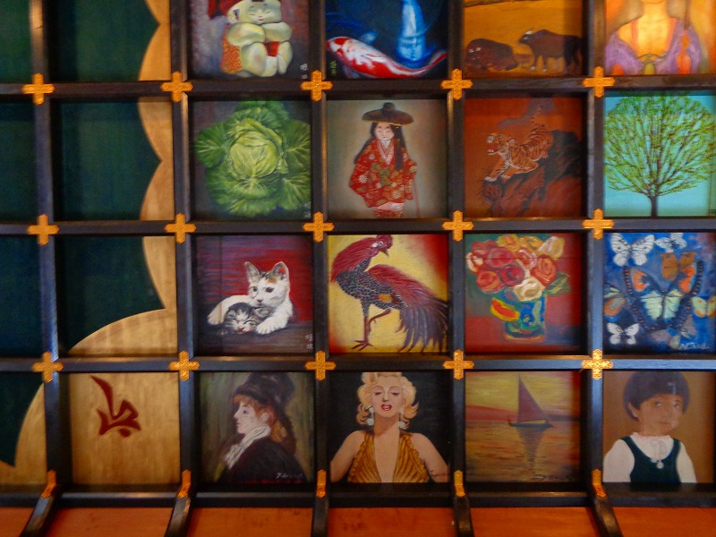 本堂内陣の格天井画。昭和53年に新築の際、全国から公募した花鳥風月から人間曼荼羅まで、575枚の絵が天井を彩る。