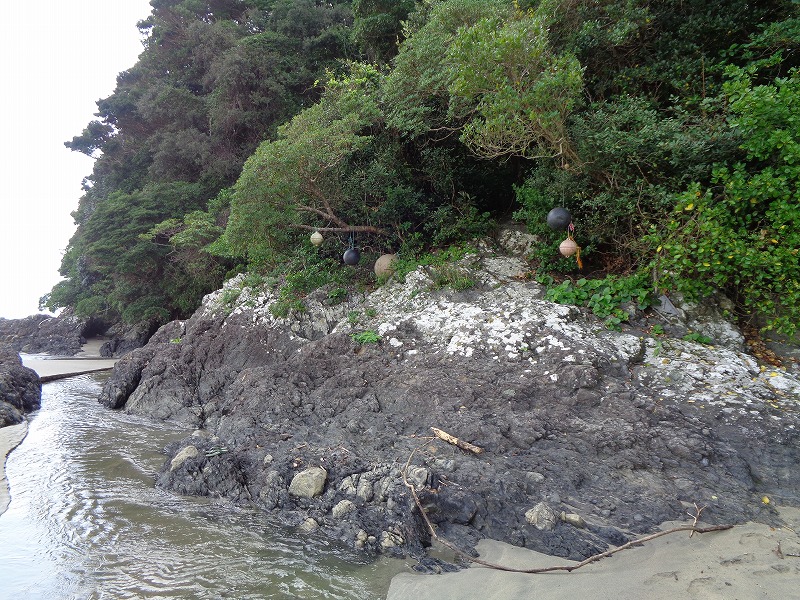 どうやら、小川の向こうの岩を登って茂みの奥へと行けるようだ。自転車担いで登れるやろうか心配だが他に道は無く、登れなければ長い長い砂浜を戻らねばならん。