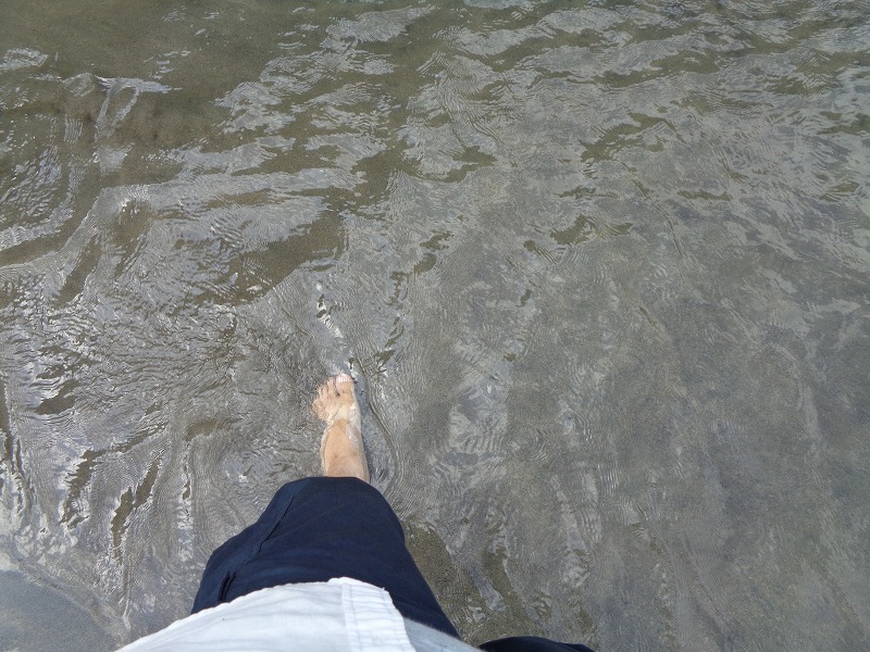 草履を脱ぎ自転車担いで小川をジャブジャブと行く。水は冷たくめちゃキレイなので裸足に心地よい。