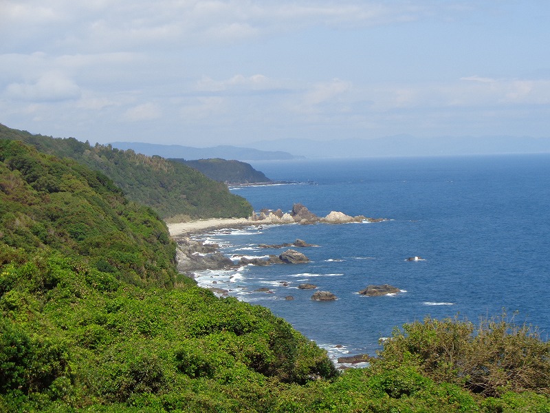 進んで来た道を振り返ると、太平洋から切り立った断崖絶壁の上に造られた道であった。