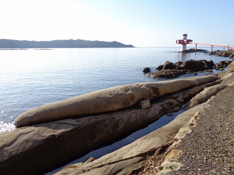 松崎しげる海岸、いやいや松崎海岸は化石漣痕(かせきれんこん)という珍しい地形だとか。化石漣痕は波や水流の影響で堆積物の表面につくられた凸凹がそのまま地層面に残されたのもで、ここ松崎海岸や落窪海岸、爪白海岸では昭和21年の南海道地震により海底より隆起し見られるようになった。