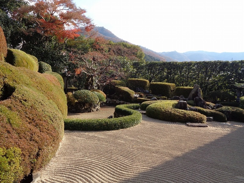 頼久寺の庭園は小堀遠州のによる蓬莱式枯山水庭園で、愛宕山を借景し白砂敷の中央に鶴島、後方に亀島の二つの低い築山状の島を置いて石を組み書院左手の山畔に沿ってサツキの大刈込みで青海波を表現している。