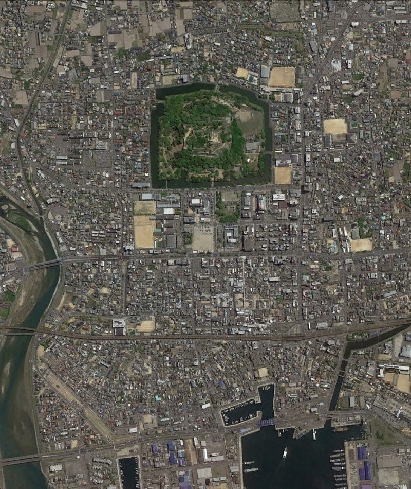 Googlemap2020 「讃岐国丸亀絵図」と同じアングルでGooglemapの航空写真を見ると、外堀はほぼすべて埋められ道路や住宅地となっている。海岸も沖合いまで埋め立てられているが、当時の海岸線は今も道路の湾曲具合で図りしえる。絵図は東南東を上にして画かれている。