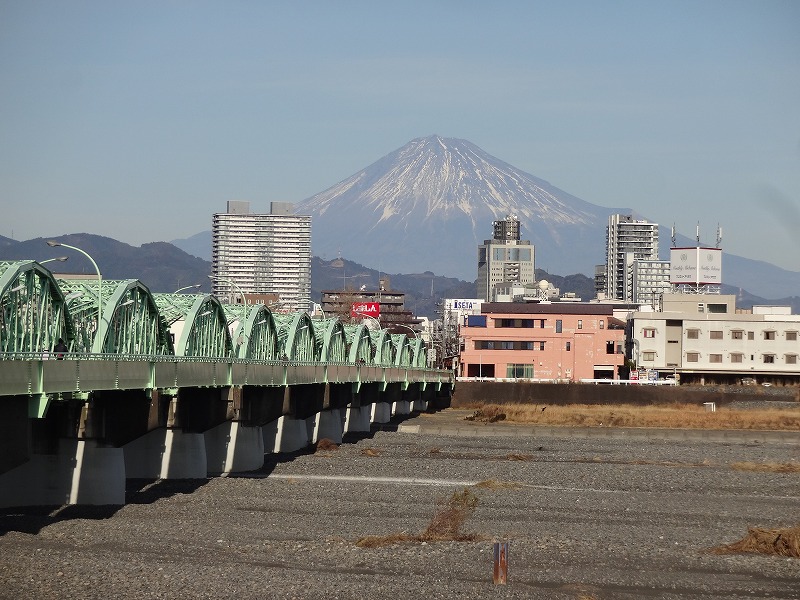 新幹線で東京出張。富士川鉄橋を渡ると、ばっちり富士山とご対面。手前のアーチ形をした連続ランガー橋は富士川に架かる水道橋。